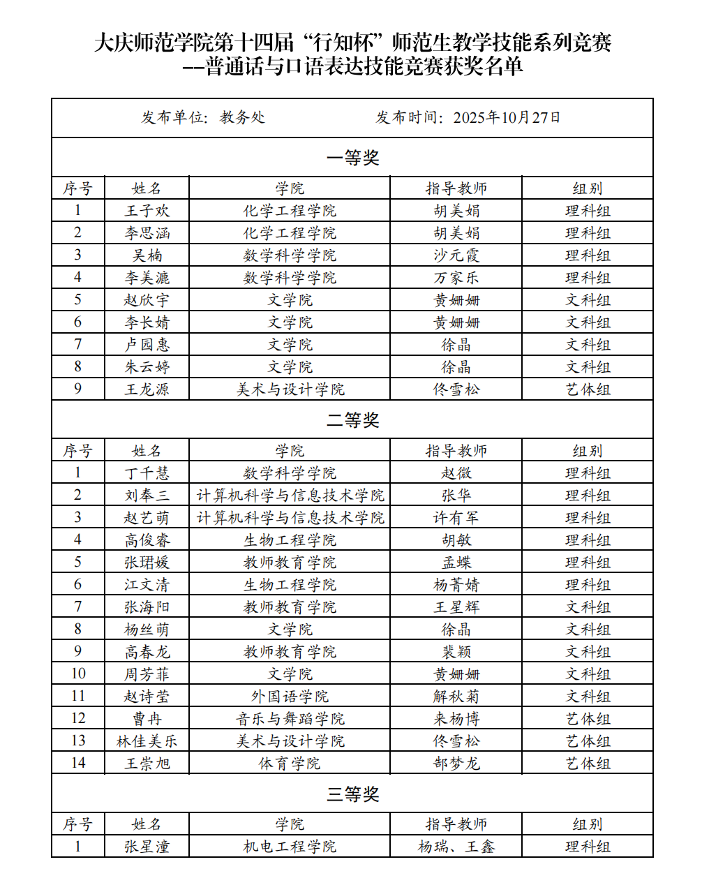 经过评委组严格评审、公正打分,竞赛最终评选出一等奖9名、二等奖14名、三等奖22名。获奖选手不仅收获了荣誉与鼓励,更在备赛、参赛过程中深化了对“教师口语”重要性的认知,提升了语言表达与教学应用的融合能力。