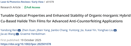 该成果于2025年10月19日在线发表于国际著名学术期刊Laser & Photonics Reviews。研究得到了黑龙江省自然科学基金(LH2024A022)等项目的共同资助。该成果亦被国内知名公众号深入解析论文,给予高度评价。(来源:机电工程学院 撰稿:刘永皓 审核:闻世宇 编辑:姜丰翼)(链接:Laser & Photonics Reviews | 卤素工程“炼金术”:解锁高稳定、可调谐铜基薄膜防伪潜力)。