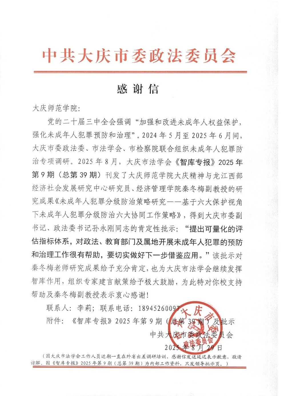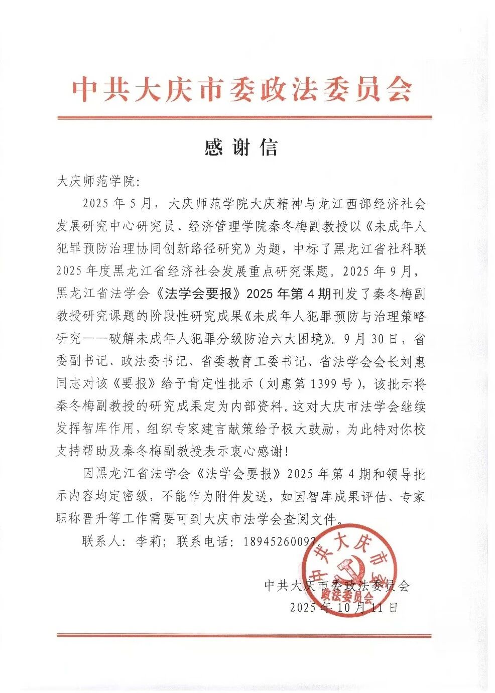 近日,我校大庆精神与龙江西部经济社会发展中心研究员、经济管理学院副教授秦冬梅承担的2025年度黑龙江省经济社会重点发展研究课题《未成年人犯罪预防治理协同创新路径研究》取得阶段性成果。其撰写的研究报告被黑龙江省《法学会要报》第4期刊发后,获得黑龙江省委副书记刘惠、大庆市委副书记孙永刚、大庆市人民检察院检察长赵倩的肯定性批示。目前,该成果已在大庆市杜尔伯特蒙古族自治县试点应用,为基层未成年人犯罪防治工作提供了实践范本。中共大庆市委政法委员会专门发来感谢信,对秦冬梅老师及学校的大力支持表示诚挚谢意。
