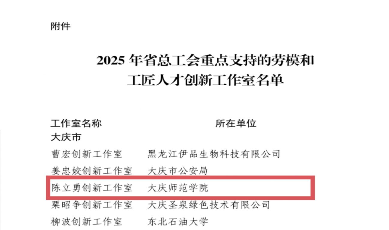 此次评选是黑龙江省总工会为持续深化产业工人队伍建设改革,做实做强我省劳模和工匠人才创新工作室品牌,充分发挥劳模工匠的示范引领、集智创新、协同攻关、传承技能作用的重要举措,评选标准严格、竞争激烈。陈立勇创新工作室的入选,是对我校科技创新成果转化、高层次人才队伍建设和特色办学育人成效的肯定。站在新的起点上,学校将以此荣誉为契机,进一步深入推进劳模创新工作室创建,提高质量、增加效益,发挥作用、扩大影响,进一步引领广大教师大力弘扬劳模精神、劳动精神、工匠精神,凝聚智慧、开拓创新,为加快大庆“三个城市”建设、助力龙江高质量发展贡献更多庆师力量。(来源:工会 撰稿:张芮荧 审核:郑志秀 编辑:姜丰翼))