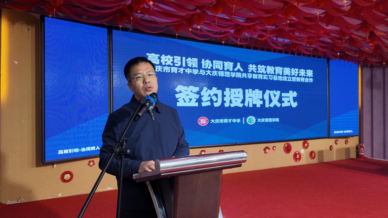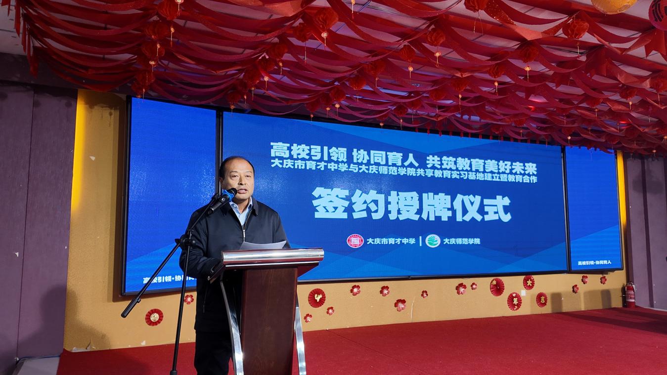 王成双在致辞中,高度肯定了大庆师范学院在师范教育领域的深厚积淀及其对地方基础教育发展的持续贡献。他介绍了育才中学在创新人才培养和特色课程体系建设方面的实践成果,并表示期待以此次合作为契机,推动高校与中学协同发展走向深入。