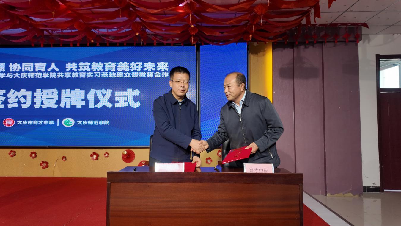 在与会领导的共同见证下,张国发与王成双分别代表双方签署了《大庆市育才中学与大庆师范学院共享教育实习合作协议》。随后,周丹与王伟共同为育才中学授牌“共享教育实习基地”。