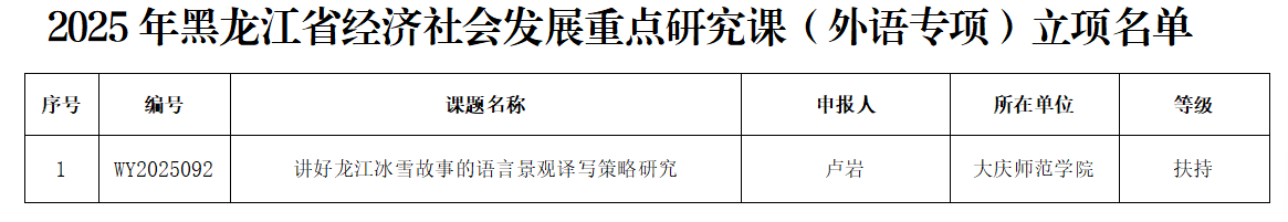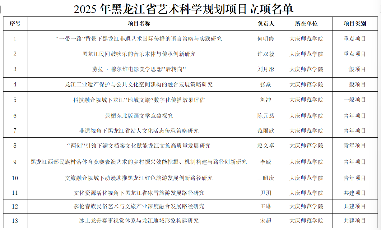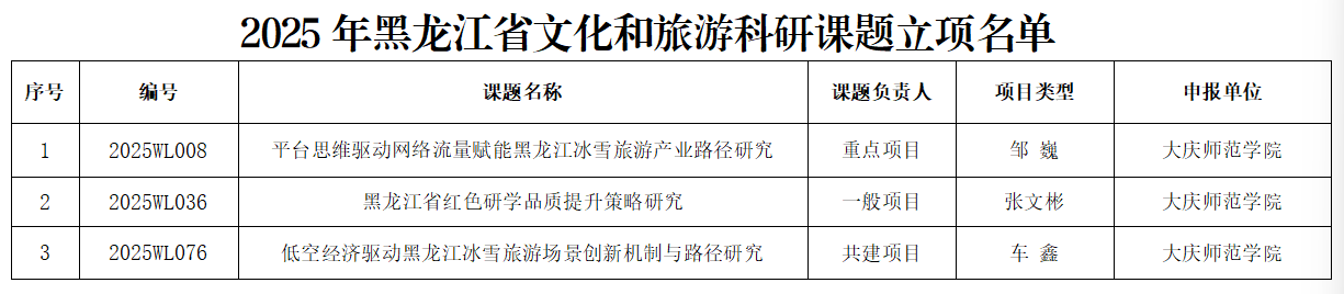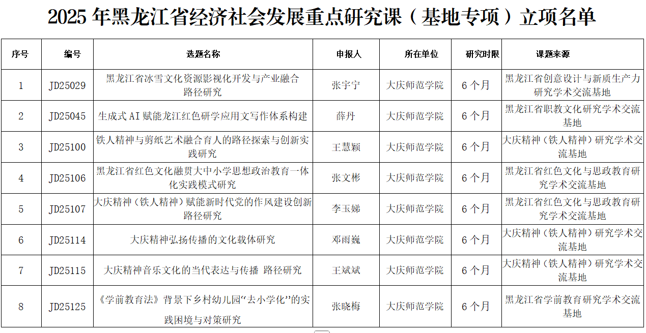 近日,黑龙江省多项省级人文社科类课题立项名单陆续公布,包括《2025年黑龙江省社科研究规划项目拟立项名单》《2025年黑龙江省艺术科学规划项目立项名单》《2025年黑龙江省文化和旅游科研课题立项名单》,以及黑龙江省社会科学界联合会发布的《2025年黑龙江省经济社会发展重点研究课题县(区)立项公告》《2025年黑龙江省经济社会发展重点研究课题(外语专项)立项公告》《2025年黑龙江省经济社会发展重点研究课题(基地专项)立项公告》。