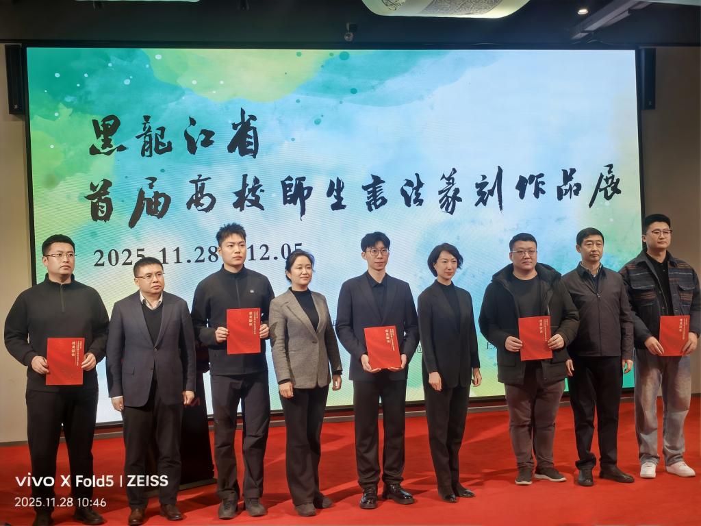 11月28日,黑龙江省首届高校师生书法篆刻作品展在黑龙江省艺术博物馆开幕。我校青年教师闫留学在本次赛事中斩获教师组金奖,并作为教师代表在开幕式上发表获奖感言,彰显了我校书法教育的扎实成效与青年教师的专业风采。