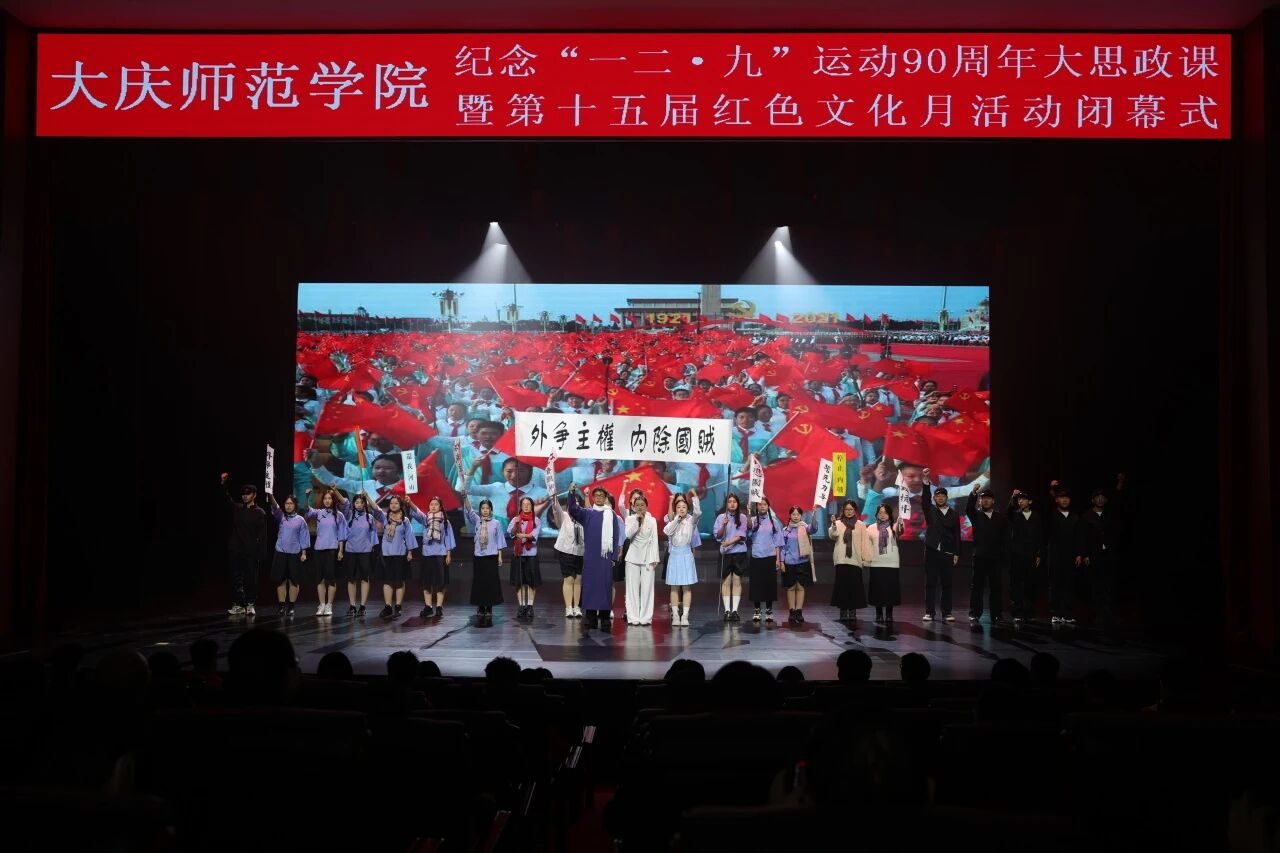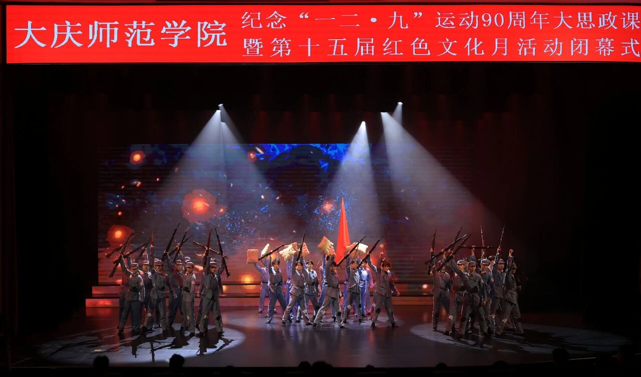 为纪念“一二・九”运动90周年,弘扬爱国主义精神,引领青年学子传承红色基因、坚定理想信念,12月8日晚,大庆师范学院在大学生活动中心举行“传承红色薪火 奋进时代征程”纪念“一二・九”运动90周年大思政课暨第十五届红色文化月活动闭幕式。校长、党委副书记张平,党委副书记滕强,党委副书记、工会主席刘迪,副校长周丹、王洪秋,党委委员、宣传统战部部长徐媛等校领导出席,与各机关部门、二级学院负责人、辅导员及学生代表共同观看这堂融思想性、艺术性、教育性于一体的大思政课。