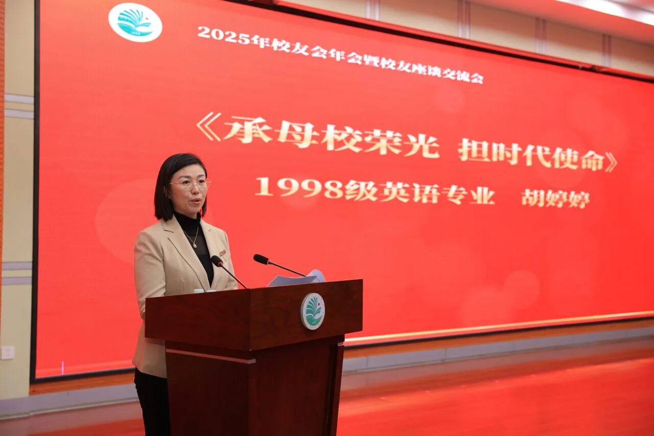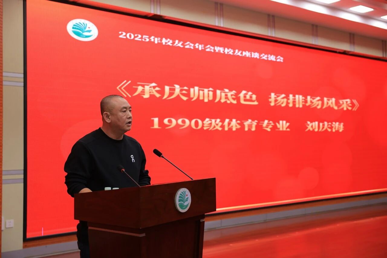 黑龙江省大庆师范学院校友会会长、学校办公室主任杜树祥作工作报告,全面总结校友会规范化建设成效、60周年校庆系列活动成果、校地企合作签约进展,以及全国22个校友会联络体系建设情况,并明确了未来工作方向:常态化开展校友活动、完善区域校友会布局、打造校友宣传交流平台,持续夯实校友工作基础。座谈交流环节,五位不同领域的优秀校友代表依次登台分享,情真意切、干货满满。大庆市人才工作中心主任、1997级数学教育专业校友杨瑞金以“以校为根 与城共生”为题,用详实数据展现庆师毕业生在大庆各条战线的中坚作用,分享校地人才协同发展的丰硕成果;大庆市外事办主任、1998级英语专业校友胡婷婷围绕“承母校荣光 担时代使命”,为母校国际化办学建言献策,提出健全海外校友联络机制、探索轻资产合作模式等宝贵建议;大庆市校友会会长、1985级汉语言文学专业校友宋丽梅分享校友会“以商养会、以会促商、抱团取暖、共同发展”的实践路径,呼吁全国校友联动资源,助力大庆振兴发展;大庆市乘风第二小学校长、1990级体育专业校友刘庆海以“承庆师底色 扬排球风采”为主题,介绍依托排球特色育人、深化院校协同发展的办学成果;1993级汉语言文学专业校友任岩深耕教育一线27载,聚焦师范人才培养,提出“双导师制”“双技术驱动”等建议,强调理论与实践深度融合,为母校人才培养精准赋能。校友们的分享,既有个人奋斗的成长感悟,更饱含反哺母校、助力家乡的责任担当,赢得现场阵阵掌声。