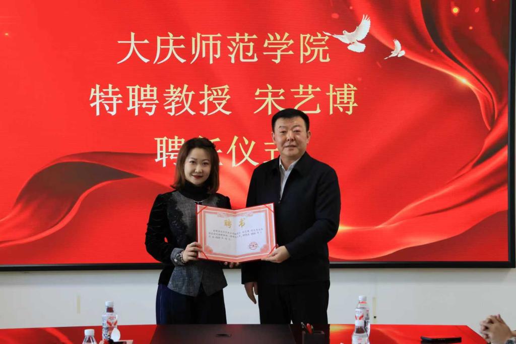 1月5日下午,大庆师范学院在主楼633会议室举行特聘教授聘任仪式,国内民族打击乐领域顶尖专家、北京民族乐团副团长宋艺博受聘为学校特聘教授。副校长许双毅为宋艺博颁发聘书,仪式由音乐与舞蹈学院院长任广明主持,学院党总支书记张雷、副院长陈毓博及教师代表参加了仪式。