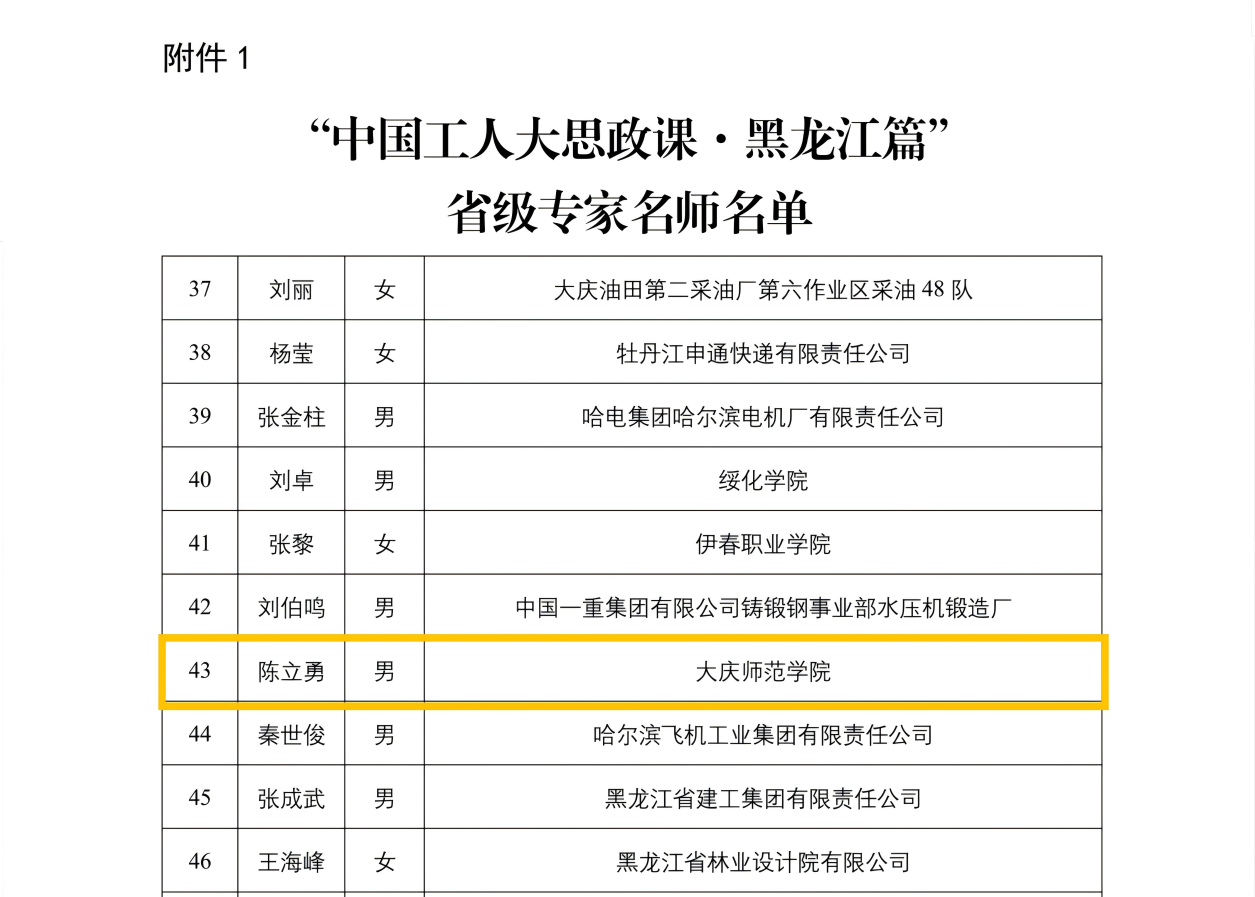 近日,黑龙江省总工会办公室印发通报,公布2025年“中国工人大思政课·黑龙江篇”省级专家名师评选结果。我校大庆精神研究基地主任陈立勇教授成功入选,为学校赢得荣誉。