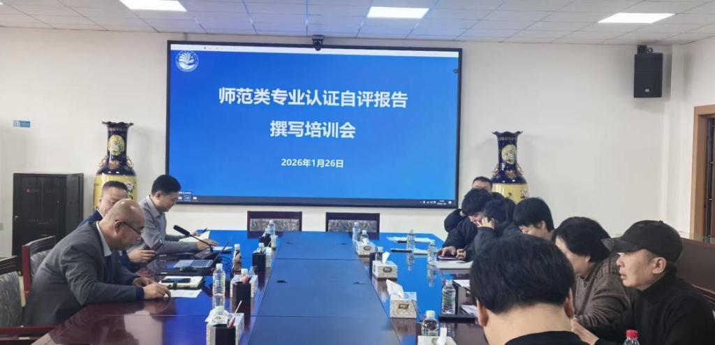 1月27日下午,学校以线上线下相结合的方式,在主楼634会议室召开师范类专业认证自评报告撰写培训会。副校长周丹主持会议并讲话。总督学郭崇林作专题培训报告。教学质量评估中心、教务处负责人及相关管理人员,体育学院、美术与设计学院班子成员,体育教育、美术学专业负责人及骨干教师等40余人参加会议。
