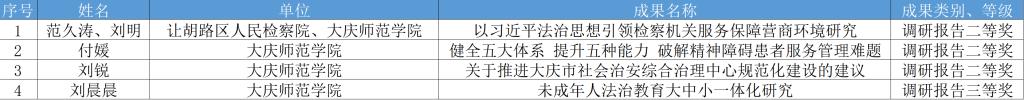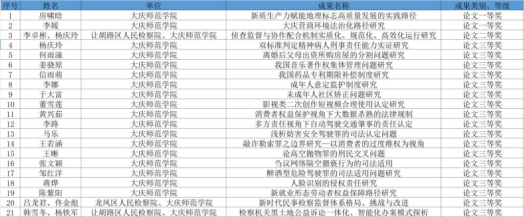 此次佳绩既是师生潜心钻研、奋勇争先的生动体现,更是学校法学教育与实践育人成效的有力彰显。学校将以此次获奖为契机,深入践行习近平法治思想,紧扣法治大庆建设与高质量发展需求,坚持以赛促学、以赛促教、赛教融合,积极搭建校地联动实践平台,不断提升学生法治素养与社会服务能力,促进更多接地气、高水平的研究成果落地转化,为地方法治建设贡献庆师力量。(来源:法学院 撰稿:白璐 审核:唐莉 编辑:姜丰翼)