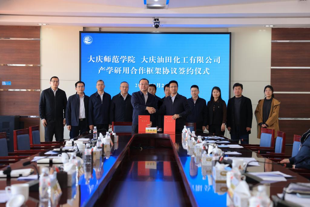 春潮涌动启新程,校企携手谱华章。3月24日,大庆师范学院与大庆油田化工有限公司产学研用合作框架协议签约仪式举行,双方正式开启全方位、深层次、高质量校企合作新篇章,聚力打造高校与石油化工产业产教融合新标杆样板。大庆油田化工有限公司经理李凌晖、总工程师邓发强、东昊公司经理刘青鑫、技术开发研究院院长禹铁军、人事部(党委组织部)主任姜大巍、计划经营部主任宿志刚,大庆师范学院党委副书记、校长张平,副校长许双毅及相关职能部门、化学工程学院负责人等出席仪式,会议由许双毅主持。