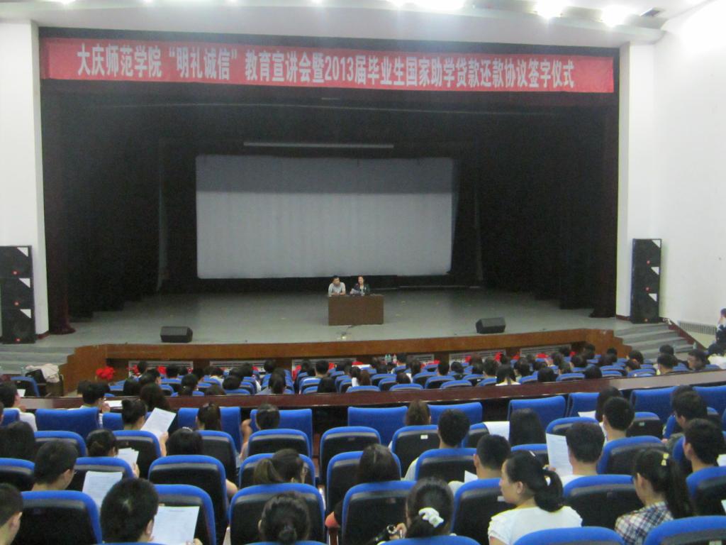6月5日上午,我校“明礼诚信”教育宣讲会暨2013届毕业生还款协议签字仪式在大学生活动中心举行,410名贷款毕业生到场签订还款协议。
