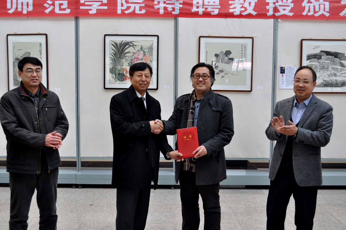 仪式上,团队负责人鄂玉梅副教授代表“中国画教学团队”发言后,副校长杨锐锋为渤海大学艺术与传媒学院院长陈国成教授颁发了特聘教授证书。