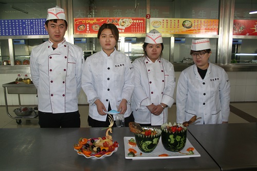 比赛正式开始。各代表队刀工搭配比拼和烹饪厨艺同时展开,配菜、切菜、拼盘、烹调,可谓精彩纷呈,煎炸煮蒸各有特色,品种齐全。同学们还为自己的参赛菜品取了“天下大同”、“梦回东坡”、“龙呈锦绣”、“鸿运连年”等丰富寓意的菜名。