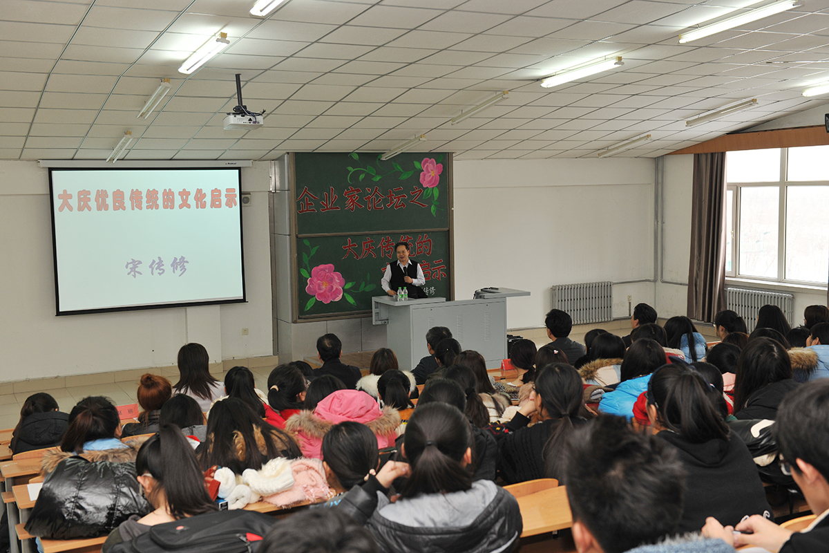 2014年12月10日下午,我校企业家论坛邀请到大庆油田采油一厂党委副书记、纪委书记、文学院兼职教授宋传修为师生作“大庆优良传统的文化启示”专题报告。