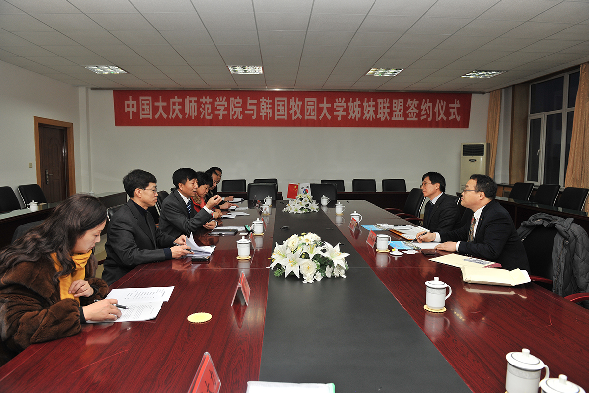 双方回顾了两校在合作方面取得的进展,商讨了我校现留学牧园大学的十一名留学生的后续学习内容及学习方式,就两校开展学生交换项目、“2+2”双学历学位教育项目、“3+1+2”硕士研究生项目、教师短期讲学、开展学生夏令营等项目展开会谈。教育科学学院、美术与设计学院、音乐与舞蹈学院负责人分别与代表团探讨了与牧园大学建立合作关系的专业范围,签署了“大庆师范学院与韩国牧园大学姊妹联盟”合作协议。