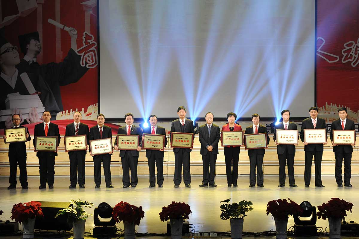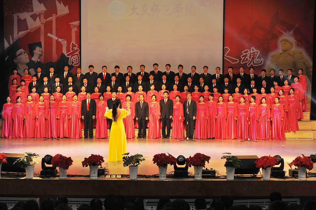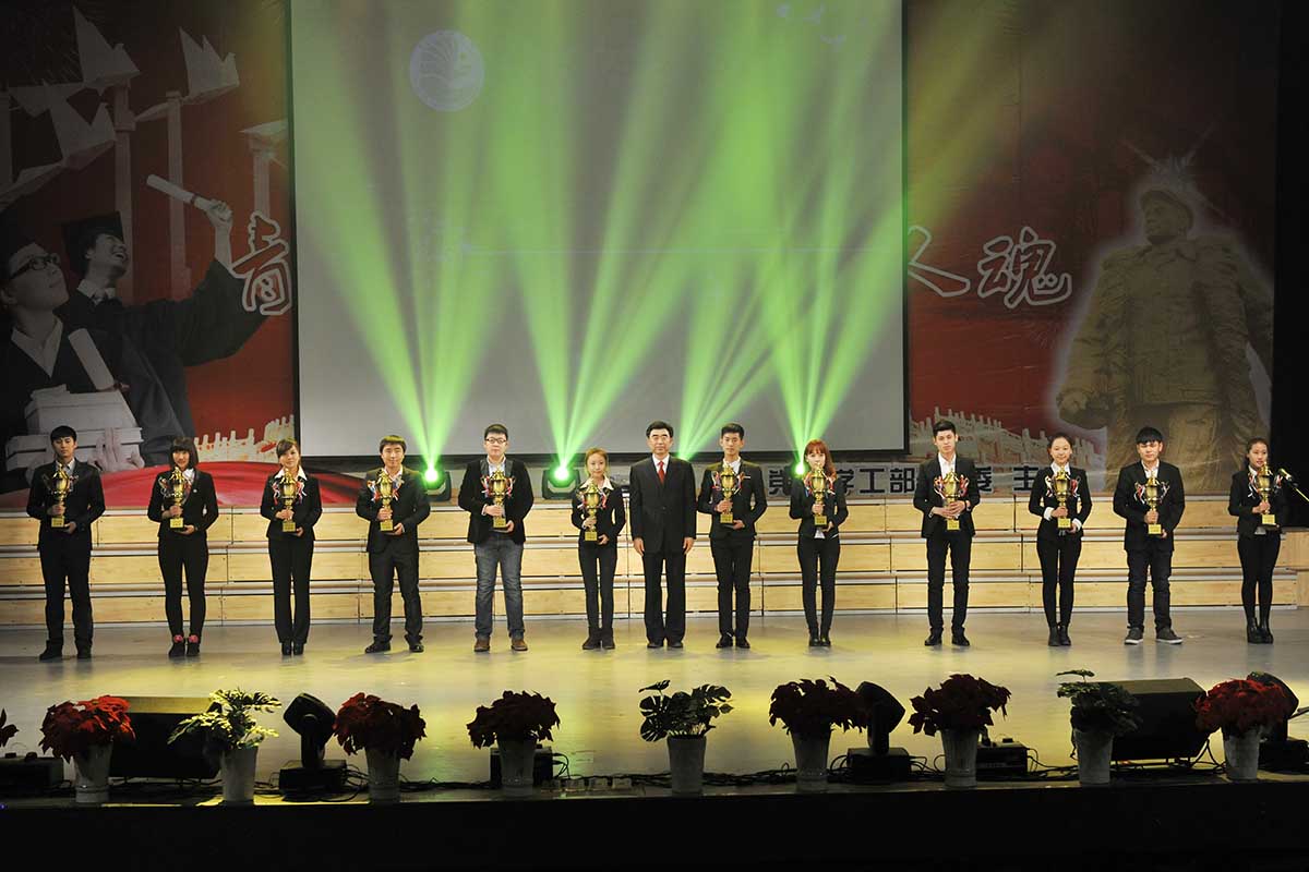 最后,出席活动的领导和各学院党总支书记、学生党支部书记、辅导员以及班主任代表共同唱响了《踏着铁人脚步走》、《歌唱祖国》,为本次颁奖典礼画上圆满的句号。
