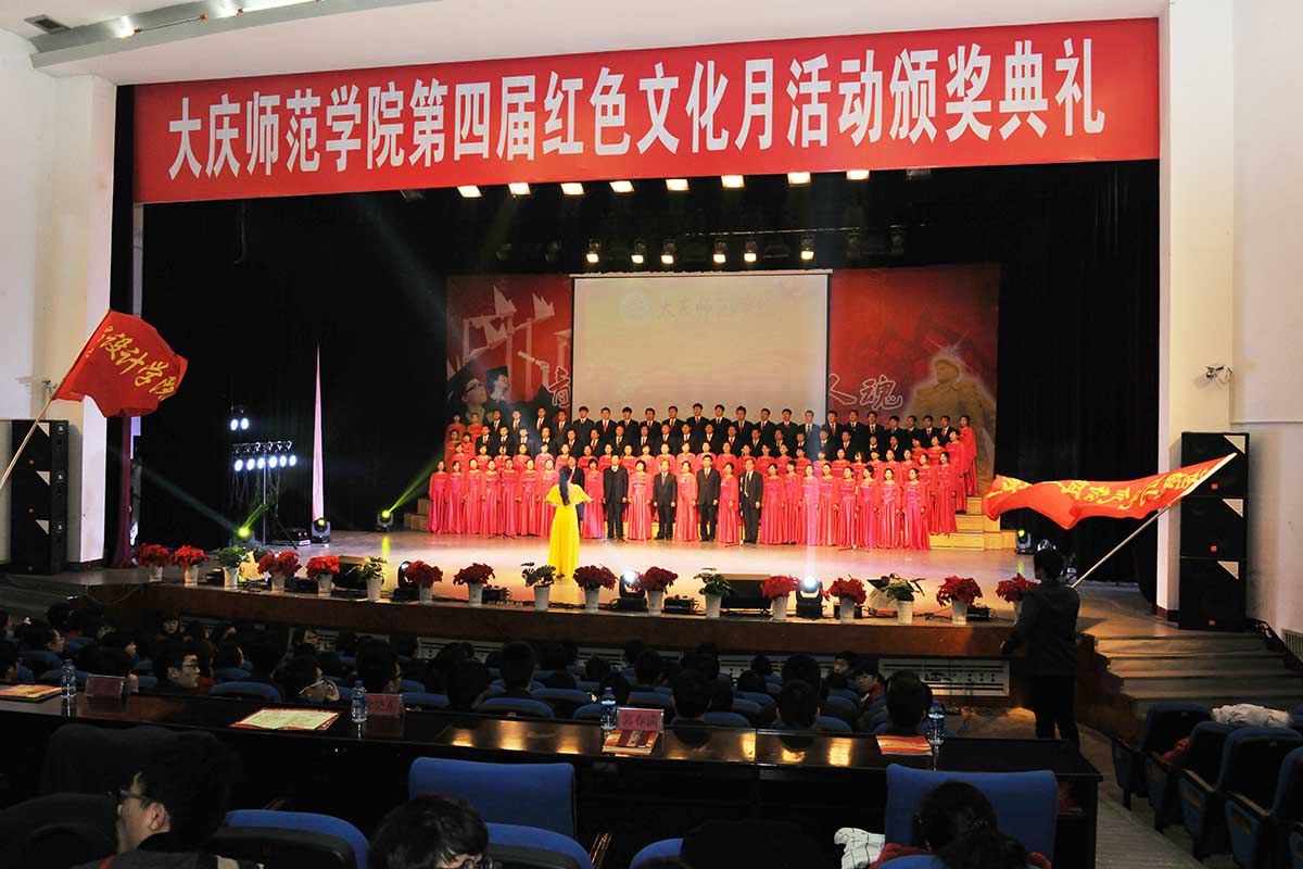 第四届红色文化月活动在学生工作部、团委与各学院团总支的共同努力下,历时36天,共举办了“红色礼赞”歌咏比赛,“礼敬中华优秀传统文化”PPT大赛,“追红色记忆,传铁人精神”红色短信、微博、微信、微分享征集评选活动,“一红到底”知识竞赛,“博学雄辩 薪传大庆魂”大学生辩论赛,“红色韵,铁人情”旅游导游中英文解说大赛,“永远的感动”书法篆刻、摄影比赛,“重拾红色记忆,再讲铁人诗话”普通话风采大赛,“庆师好声音”经典歌曲比赛等9项系列活动,共有1630余名选手参赛,约有13000人次受到教育。整个文化月活动比赛共评出一等奖16个,二等奖33个,三等奖58个,优秀奖46个。文学院、教师教育学院、计算机科学与信息技术学院、物理与电气信息工程学院获得优秀组织奖;化学化工学院、生命科学学院、法学院、体育学院获得最佳风尚奖;音乐与舞蹈学院、美术与设计学院、外国语学院,经济管理学院获得最佳效果奖。