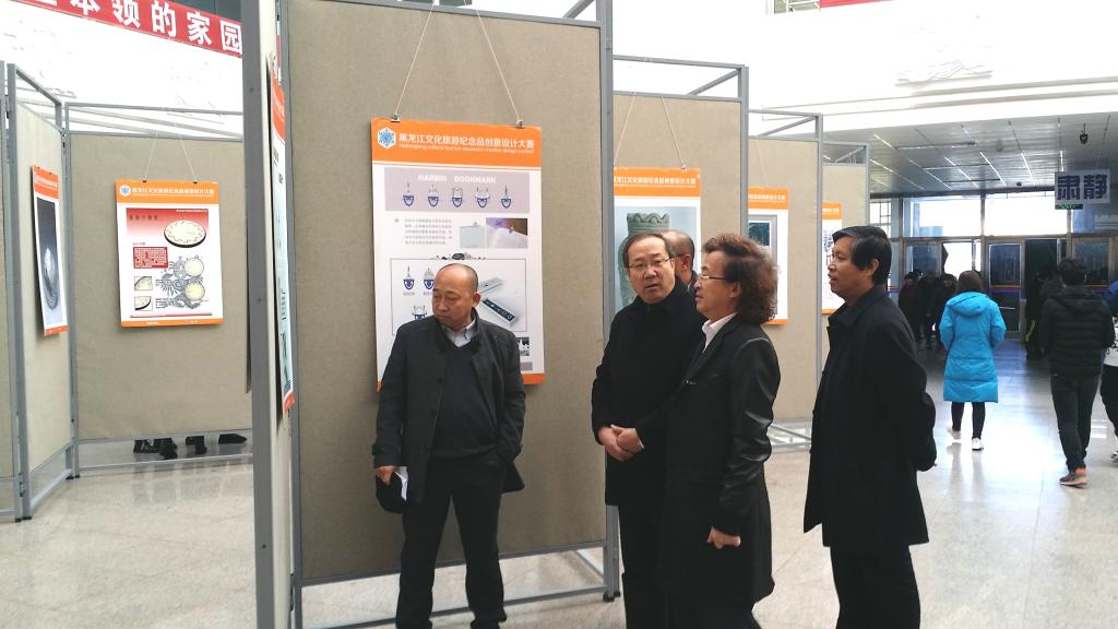 11月17日,由中共黑龙江省委宣传部、黑龙江省工业和信息化委员会、黑龙江省文化厅、黑龙江省教育厅、黑龙江省旅游局、黑龙江省农业委员会主办,黑龙江省艺术设计协会承办的“黑龙江省文化旅游纪念品及绿色食品包装创意设计大赛”130余件获奖作品大庆巡展在我校图书馆阳光大厅展出。省艺术设计协会执行会长、秘书长张震甫教授,我校宣传部部长李华、科研处处长周丹,美术与设计学院师生150多人参加了开幕式。