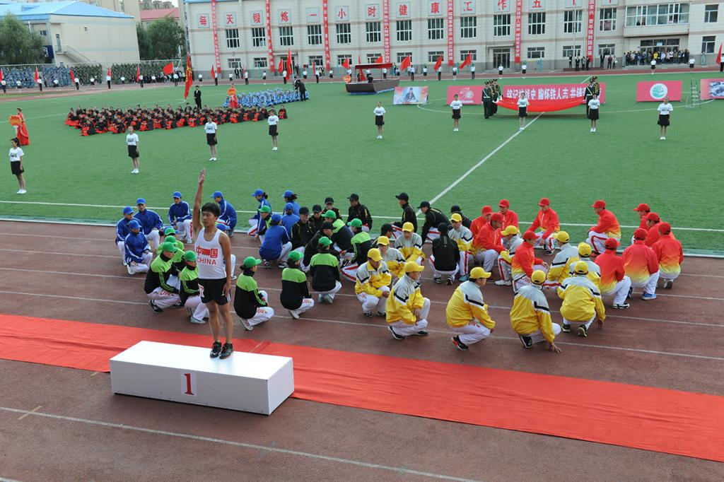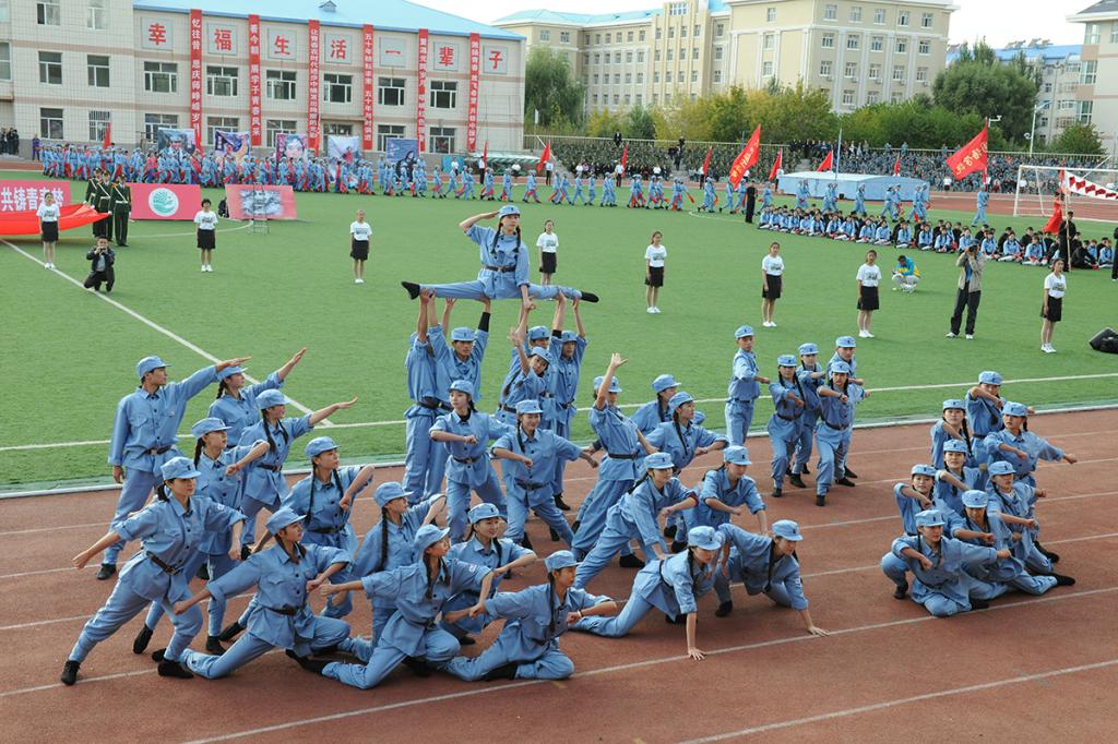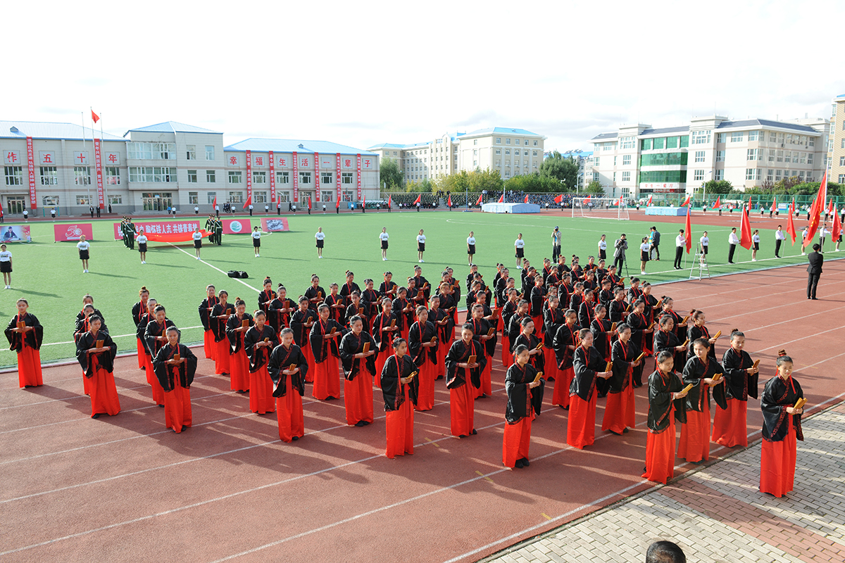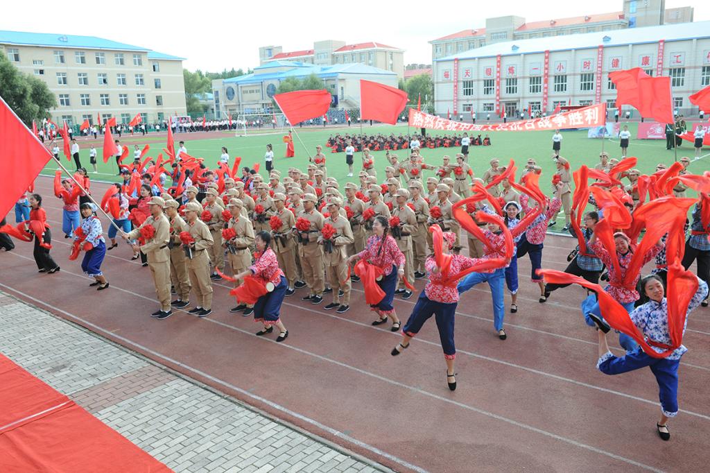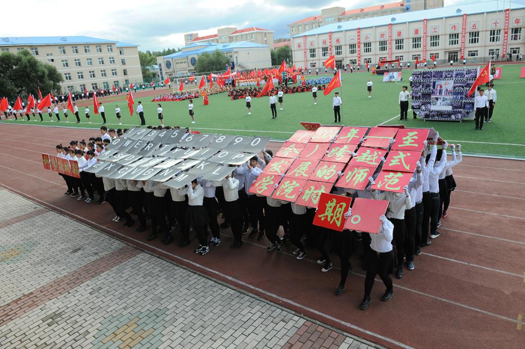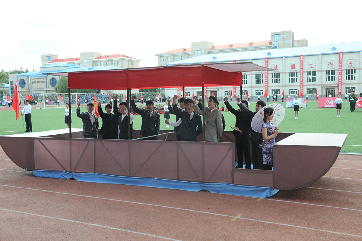 文学院学生身着汉服,手捧简牍,齐诵“大学之道,在明明德,在亲民,在止于至善……”向大家展示了国学文化和周礼的独特魅力;美术与设计学院学生身着五四青年装高举“纪念抗日战争胜利70周年”、“庆祝大庆师范学院建校50周年”横幅,振臂高呼“为了中华民族的伟大复兴、为了中国人民百年梦圆,我们一定砥砺品性、刻苦钻研!”的铮铮誓言;当经济管理学院“南湖红船”缓缓驶来,中国共产党正式成立的历史在这一刻重现,“共产党万岁!第三国际万岁!共产主义万岁!”呼出了时代最强音;化学工程学院让赵一曼、刘胡兰、江竹筠、董存瑞、张思德这些英雄的名字在人们脑海中再次浮现;外国语学院学生在《十送红军》曲调中展现了军爱民,民拥军的感人场面,表达了人民与军队的鱼水深情;音乐与舞蹈学院学生以舞蹈形式表演的《游击队歌》以专业的演绎征服了全场观众;教师教育学院用军民欢庆的形式表现了庆祝抗战胜利的热烈场面;当体育学院学生在会场上摆出奥运五环图案时,许海峰、郎平、邓亚萍、李宁、王军霞等奥运冠军们的拼搏进取精神再次让人为之振奋;计算机与信息技术学院学生用人海再现了大庆会战中“人拉肩扛”“端水保开钻”等经典时刻,让铁人旗帜熠熠闪光;机电工程学院学生组成的计算机键盘贯通历史长河,再现了学校50年发展的每一个重要历史瞬间;随着《茉莉花》音乐响起,生物工程学院学生组成的绿丛花海里,最美女教师张丽莉让全校师生无比骄傲与自豪;在《中华人民共和国宪法典》翻动中,在庄严的国旗下,法学院学生宣誓“捍卫法律尊严,全面依法治国,开启中国法治新时代。”