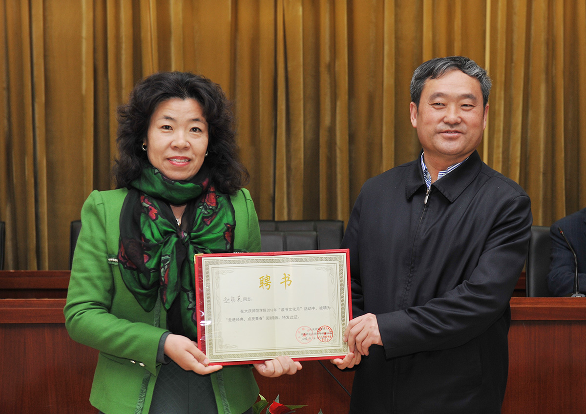 会上,学生处处长郭春满宣读了共青团大庆师范委员会文件《关于举办读书月活动的通知》。之后隆重介绍了在全校教师中遴选、聘请的10名阅读导师:张虹、赵丽、李枫、原昊、赵桂英、张小兰、张立翔、张永忠、邵春、徐权。他们将指导学生阅读,参与读书沙龙,作专题报告,切实当好学海中的领航者。徐克明校长亲自为10位导师颁发了聘书。