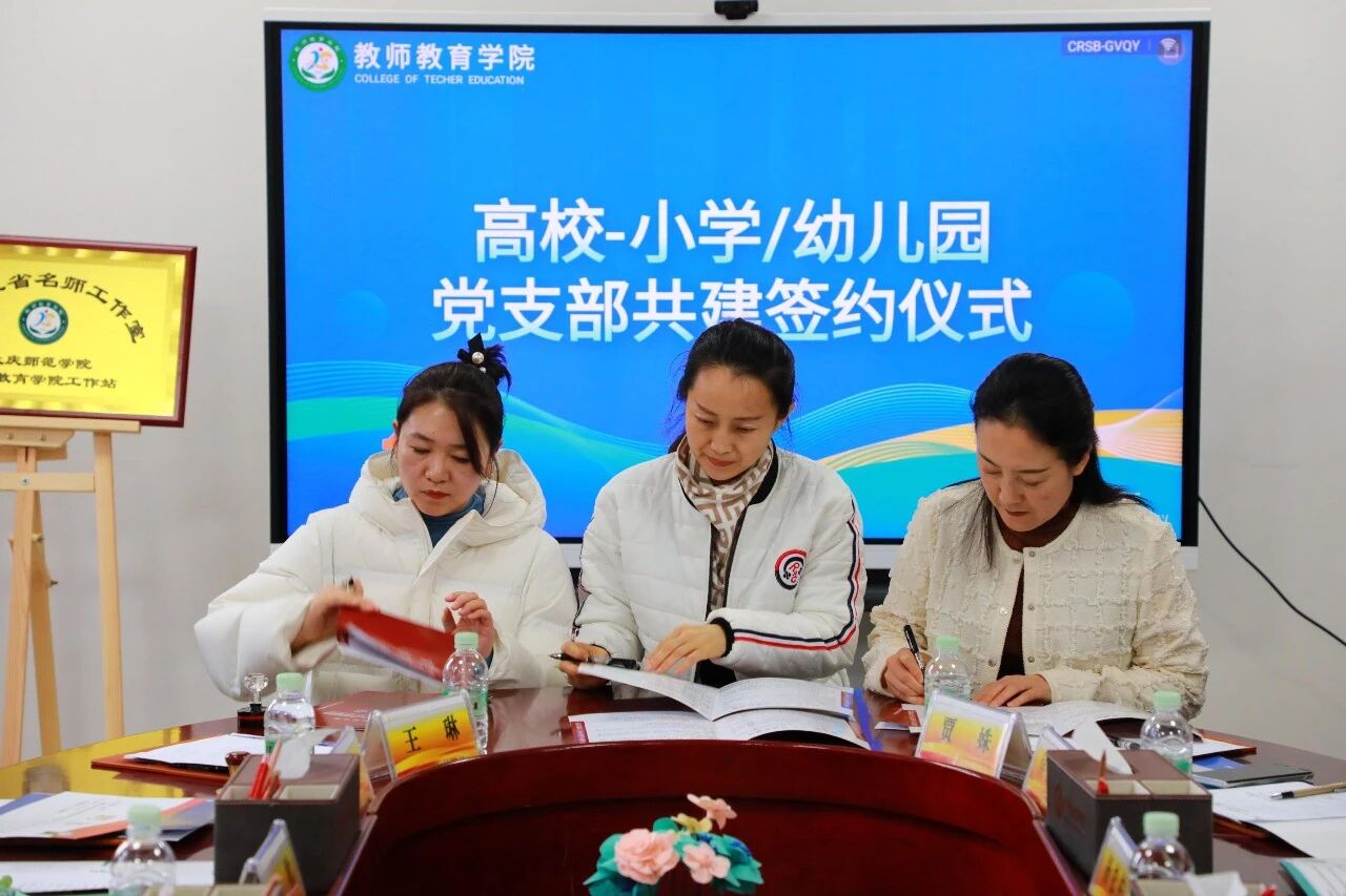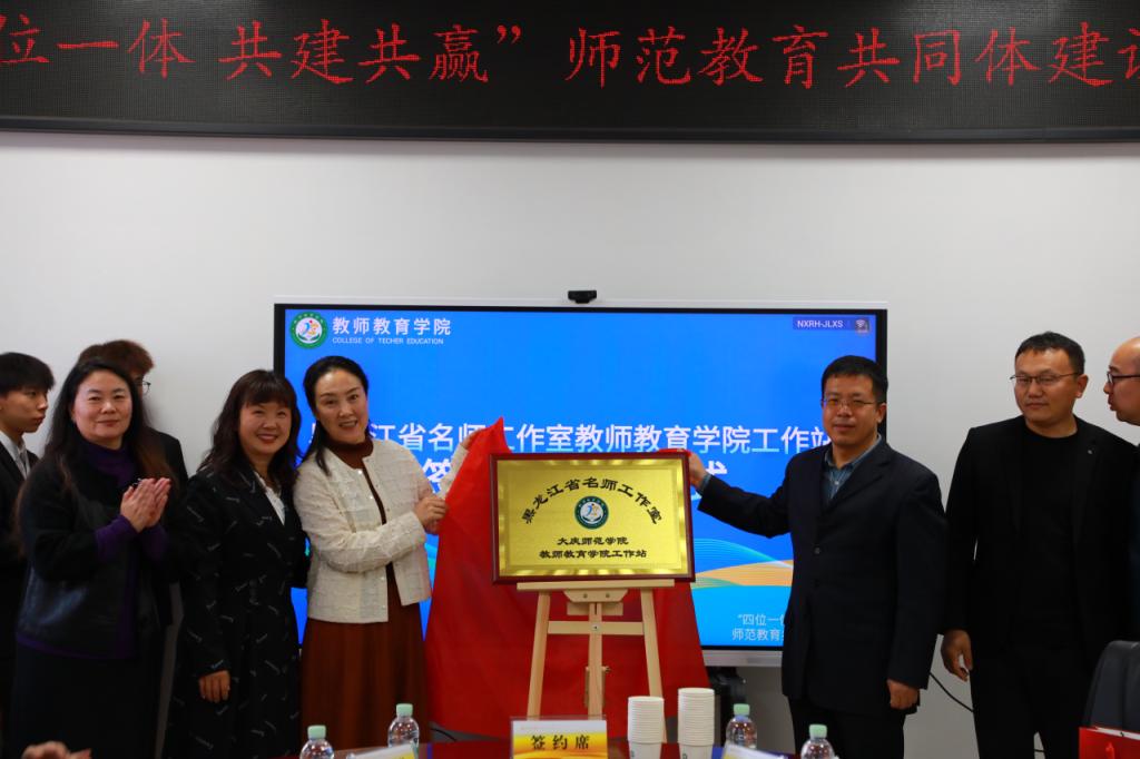 在随后举行的系列签约与聘任仪式上,多项合作成果落地生根,标志着共同体建设进入了实体化、制度化、常态化运作的新阶段。一是共建名师工作站,举行了“省名师工作室教师教育学院工作站”揭牌仪式,旨在充分发挥名师的专业引领作用;二是与大庆市铁人学校、大庆市让胡路区第一小学、大庆市幼教中心、铁人学院幼教管理部等19家实践单位签署了实习(就业)基地协议,为师生提供更稳定、更优质的实践平台;三是聘任宋歌等35名骨干教师为教师教育学院校外导师,全程参与师范生实践能力培养;四是党支部共建,创新性地启动了共同体内高校、小学、幼儿园3家党支部的共建仪式,以高质量党建引领业务深度融合。