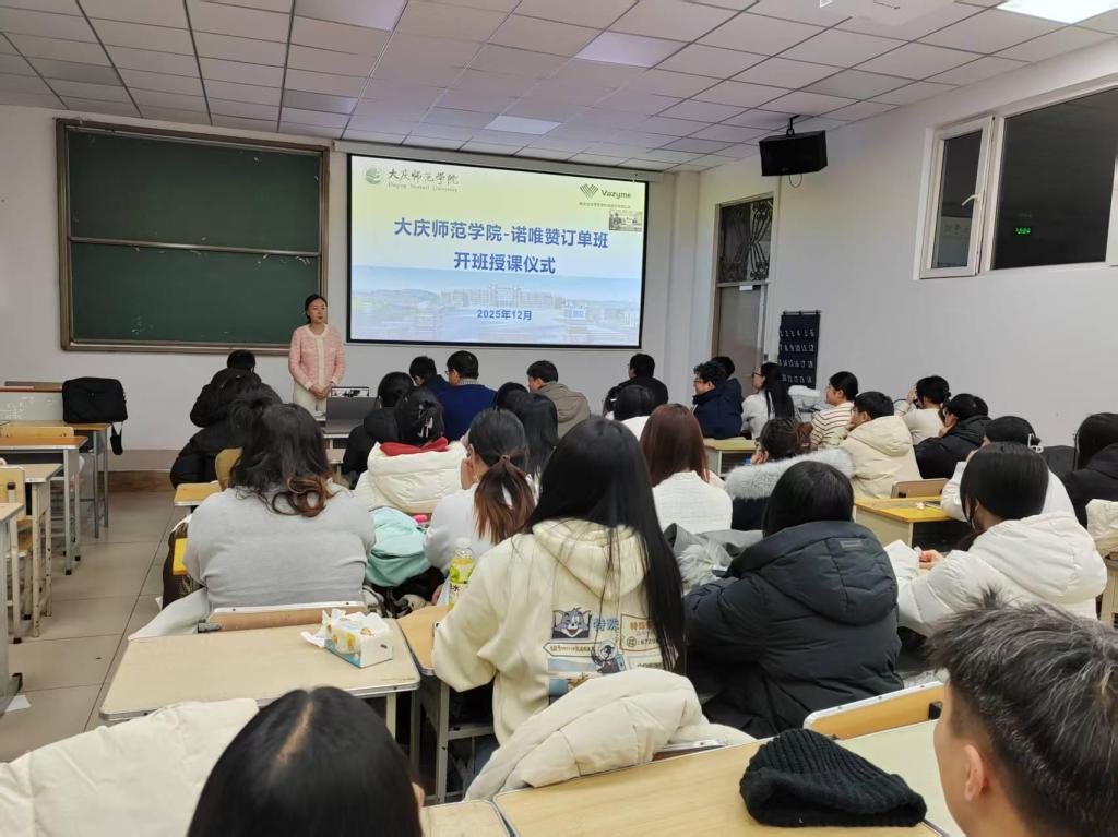 2025年12月2日,大庆师范学院与南京诺唯赞生物科技股份有限公司联合成立的“大庆师范学院—诺唯赞”订单班开班授课仪式在主楼211教室正式举行。大庆师范学院教务处处长张国发,生物工程学院党总支书记、院长任国领,党总支副书记常贺,副院长殷亚杰,南京诺唯赞生物科技股份有限公司生命科学事业部质量总监任顺利,人力资源部HRBP经理任兴义,生物技术和生物制药师生代表及学工办主任、辅导员共同出席开班授课仪式。仪式由生物工程学院副院长曲丽娜主持。