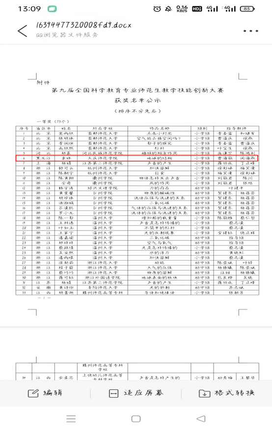 2021年12月4日,教师教育院小学教育专业2019级学生袁姝同学在曹海丽、闵海燕老师的指导下,在第九届全国科学教育专业师范生教学技能创新大赛中荣获一等奖,这是该专业学生连续三次在本教学技能大赛中获奖。